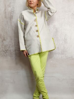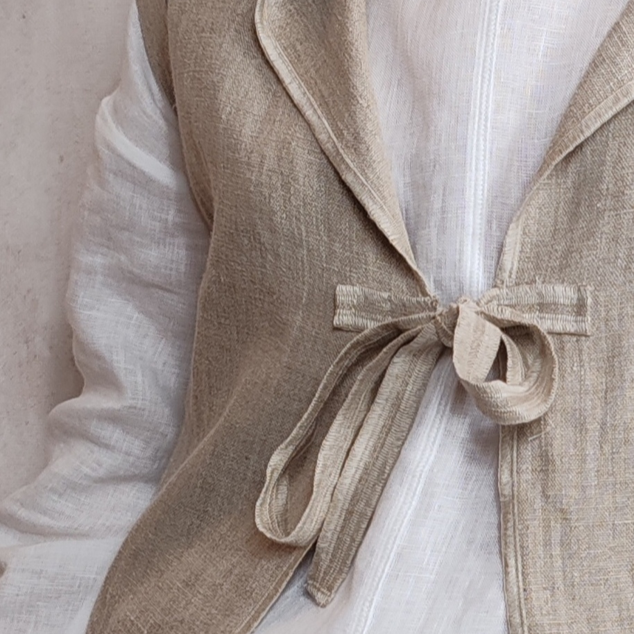 Luźny krój oversize miękko układa się na sylwetce i daje swobodę ruchów. Kamizelka może być noszona zarówno jako samodzielny element, jak i w zestawieniu warstwowym – w bardziej minimalistycznych i spokojnych stylizacjach. Zobacz również inne projekty z naszej pracowni Żakiet lniany Amelia