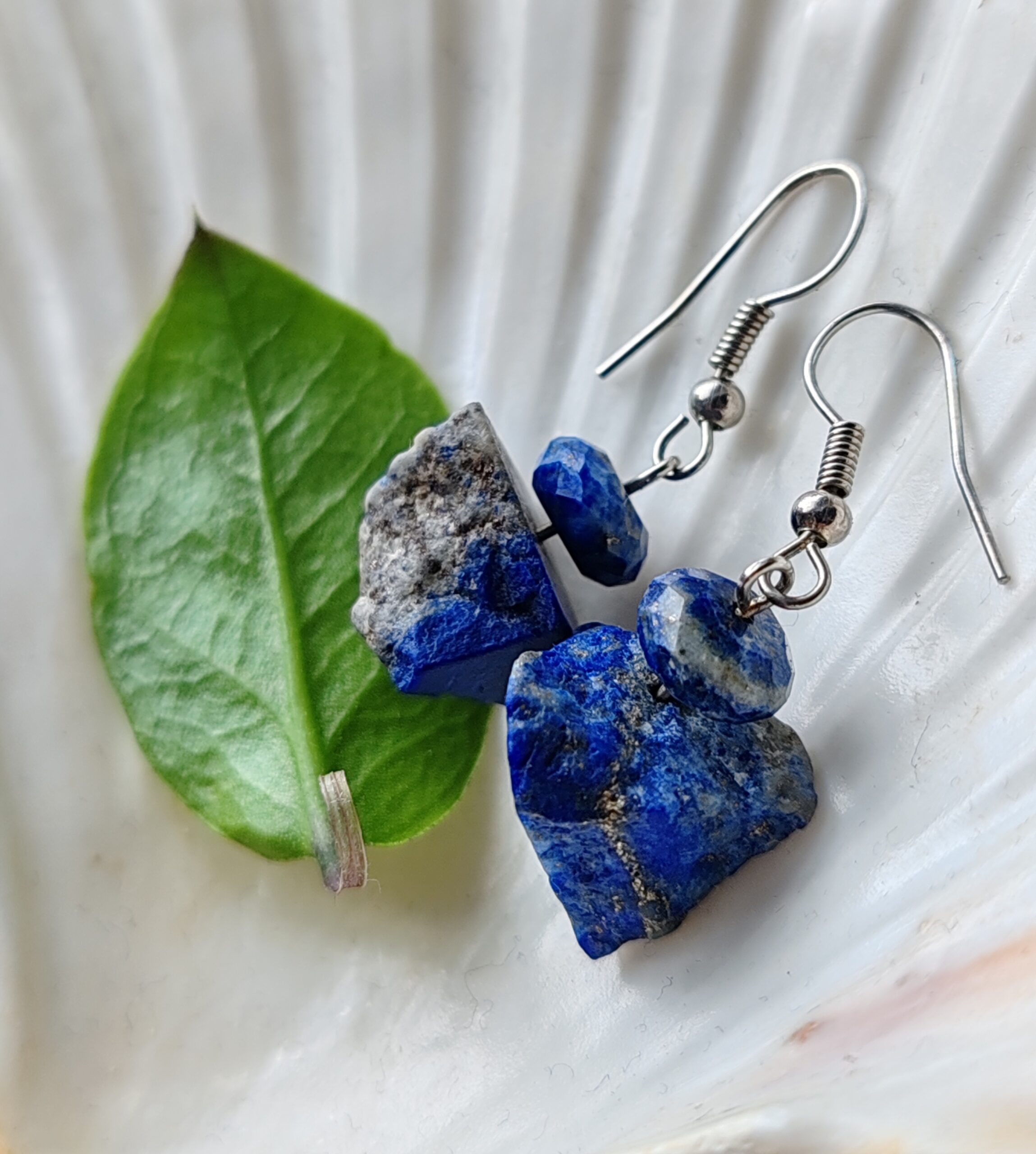 Zanurz się w głębię niebieskiego kamienia. Te ręcznie wykonane kolczyki to wyjątkowe połączenie surowego, nieoszlifowanego lapisu lazuli z gładkimi, szlifowanymi koralikami. Całość została osadzona na elementach ze stali nierdzewnej – trwałych, antyalergicznych i subtelnie połyskujących.