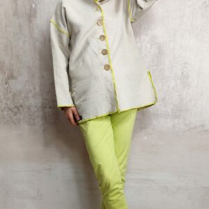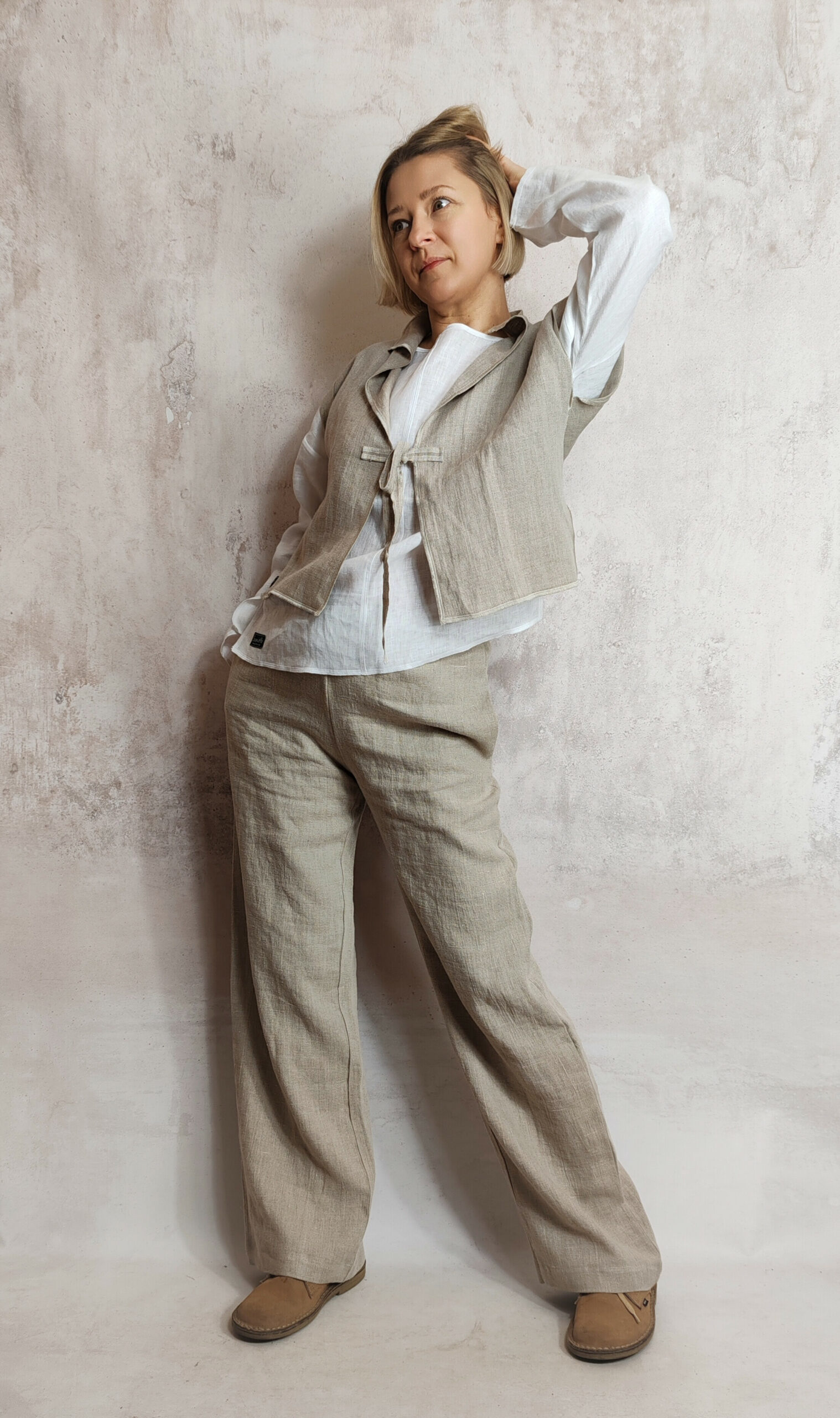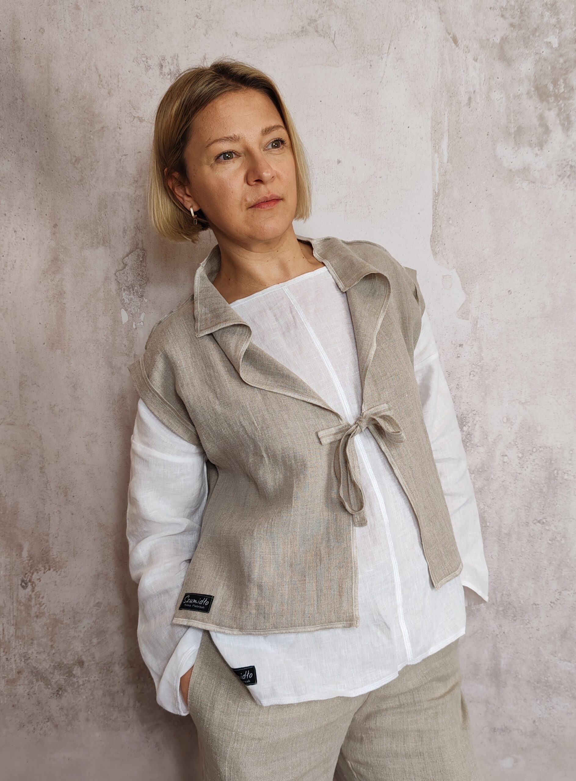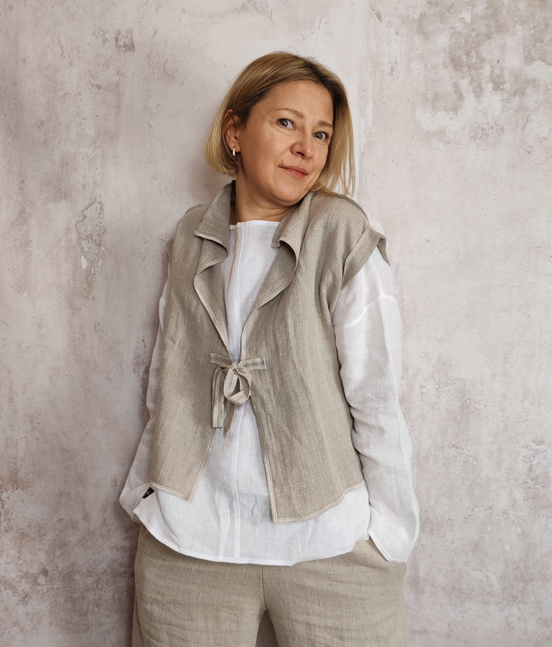 Kamizelka wykonana z wysokiej jakości lnu o surowej, szlachetnej fakturze. Lekko taliowana, miękko układa się na sylwetce, nie krępując ruchów. Charakterystyczne wiązanie z przodu pozwala regulować dopasowanie i podkreśla rękodzielniczy charakter projektu.