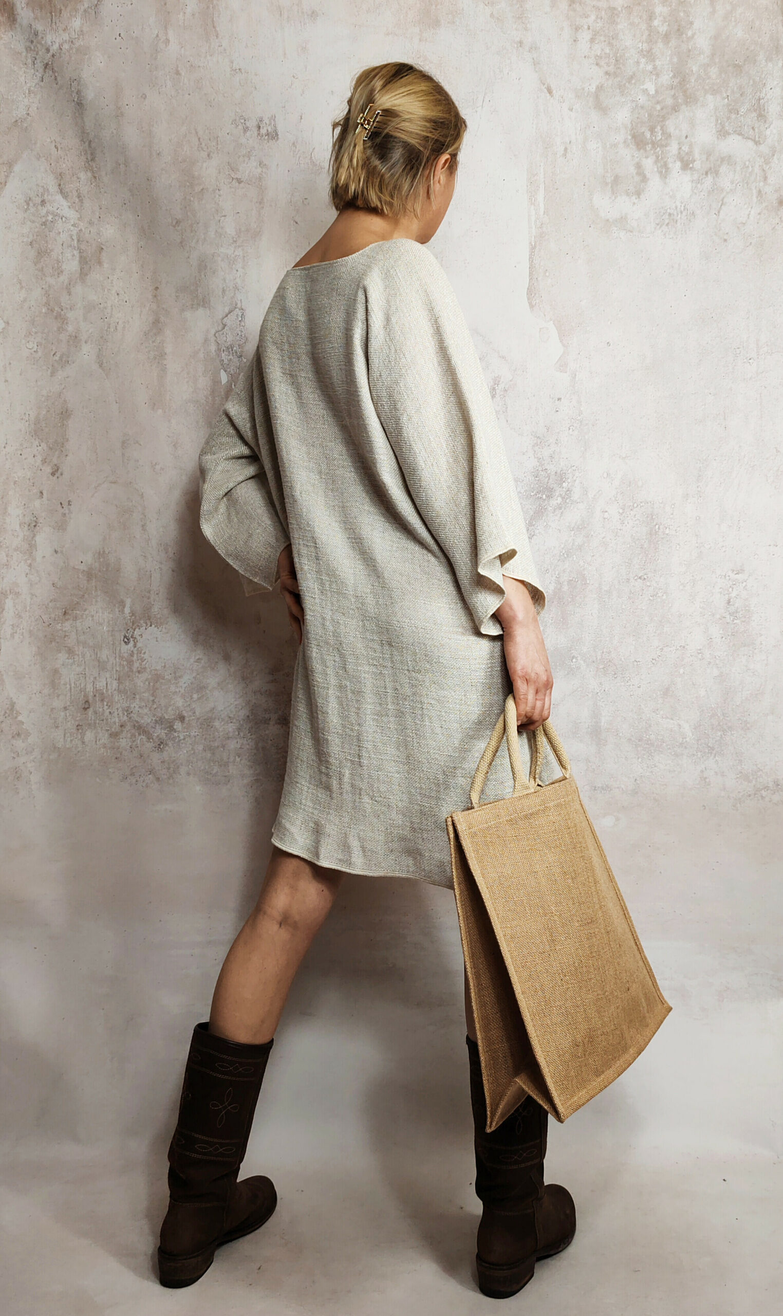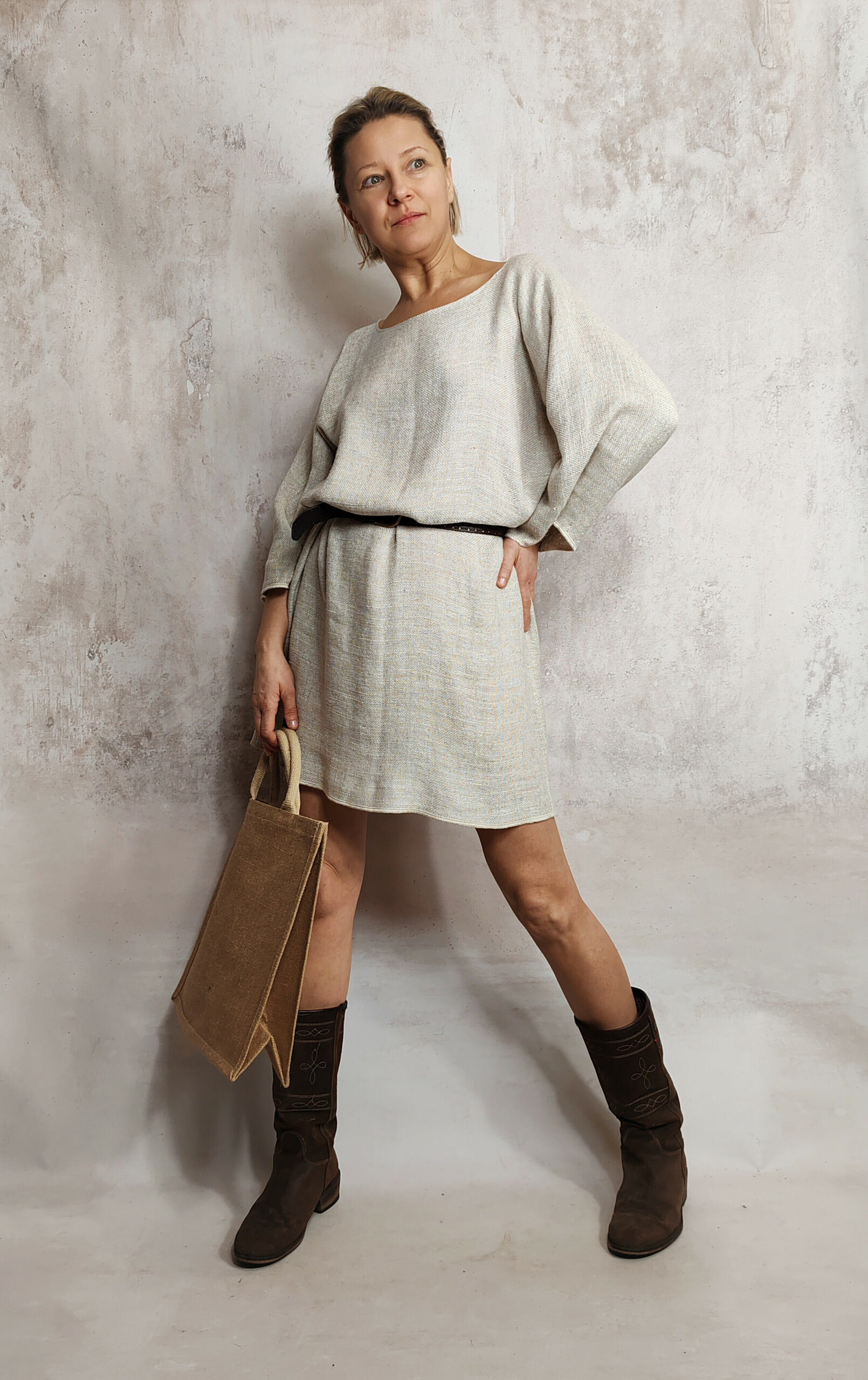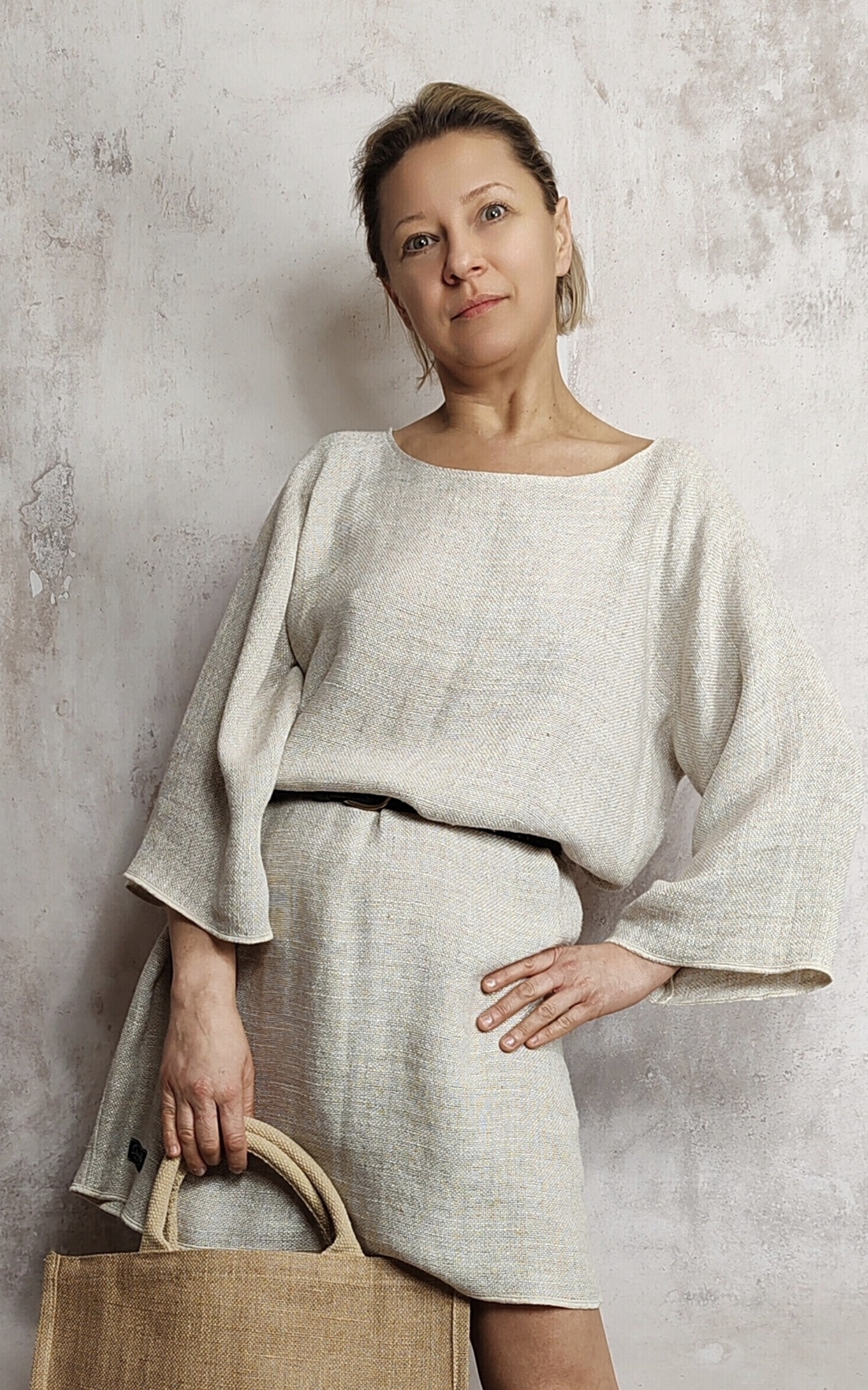 Lniana sukienka ” Róza” o swobodnym, oversize’owym fasonie, zaprojektowana z myślą o komforcie i cichej elegancji. Wykonana z dzianiny lnianej z dodatkiem jedwabiu — miękkiej, delikatnej dla skóry, a jednocześnie wyraźnie strukturalnej. Beżowy melanż tworzą jaśniejsze i ciemniejsze nitki, które subtelnie odbijają światło i nadają tkaninie głębi oraz szlachetności.
