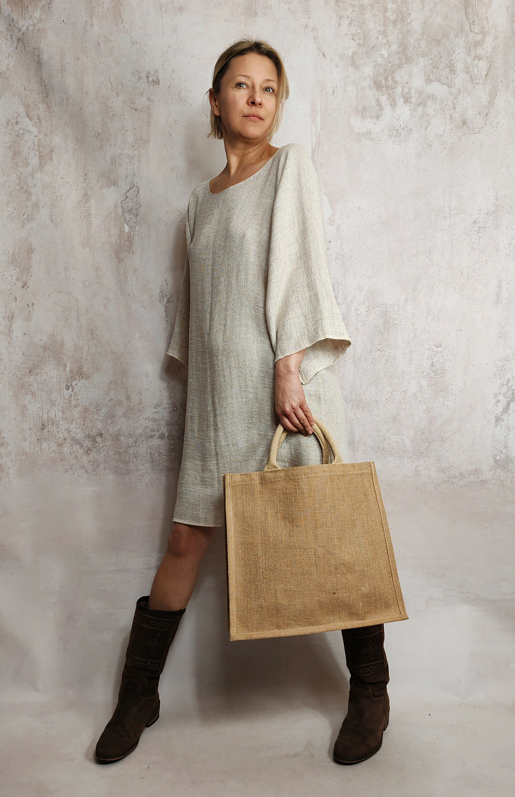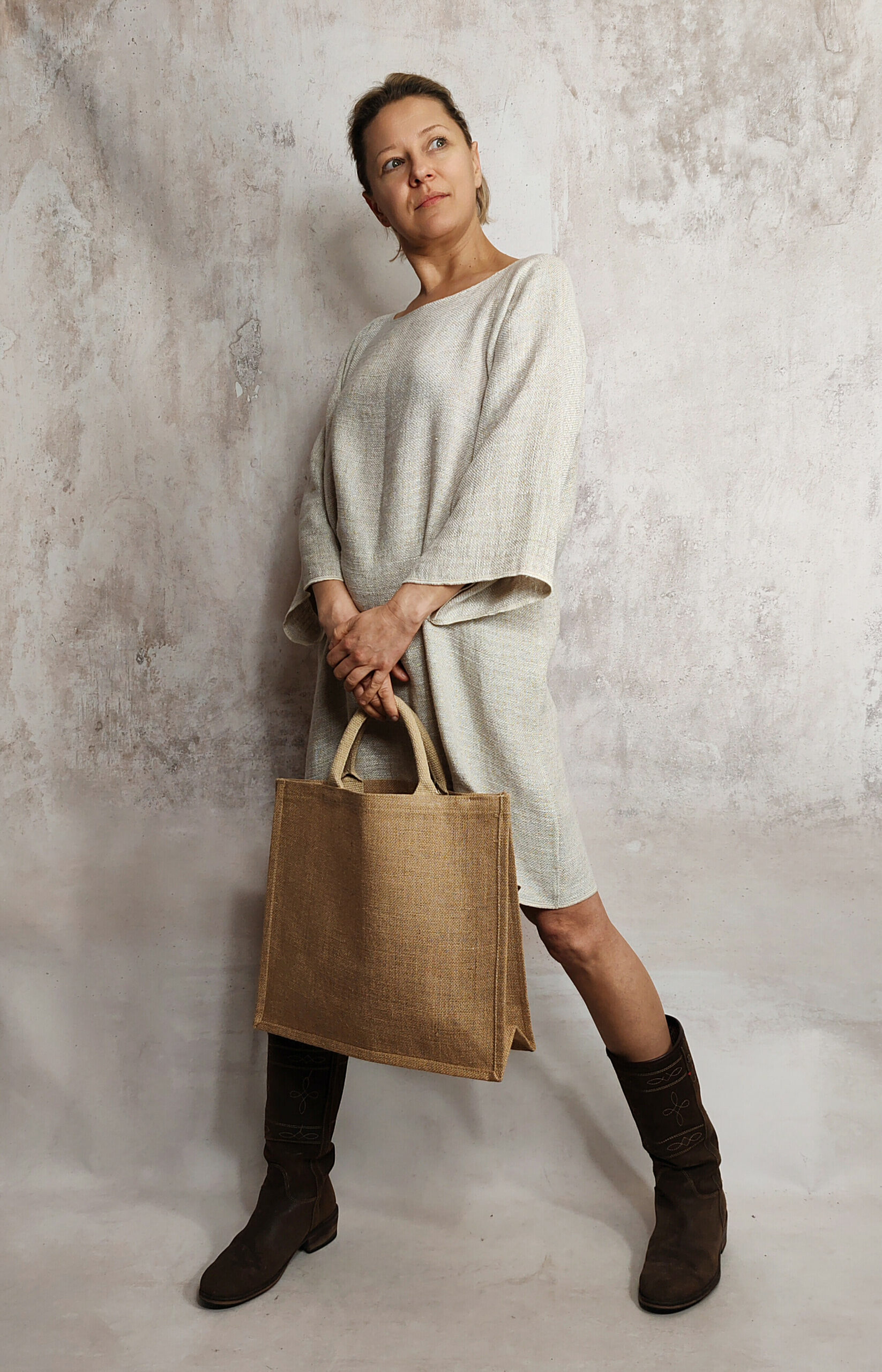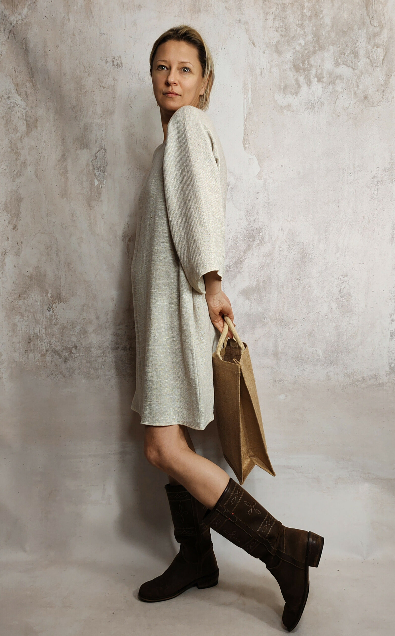 Lniana sukienka ” Róza” o swobodnym, oversize’owym fasonie, zaprojektowana z myślą o komforcie i cichej elegancji. Wykonana z dzianiny lnianej z dodatkiem jedwabiu — miękkiej, delikatnej dla skóry, a jednocześnie wyraźnie strukturalnej. Beżowy melanż tworzą jaśniejsze i ciemniejsze nitki, które subtelnie odbijają światło i nadają tkaninie głębi oraz szlachetności.