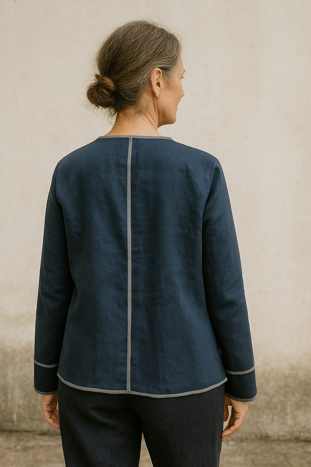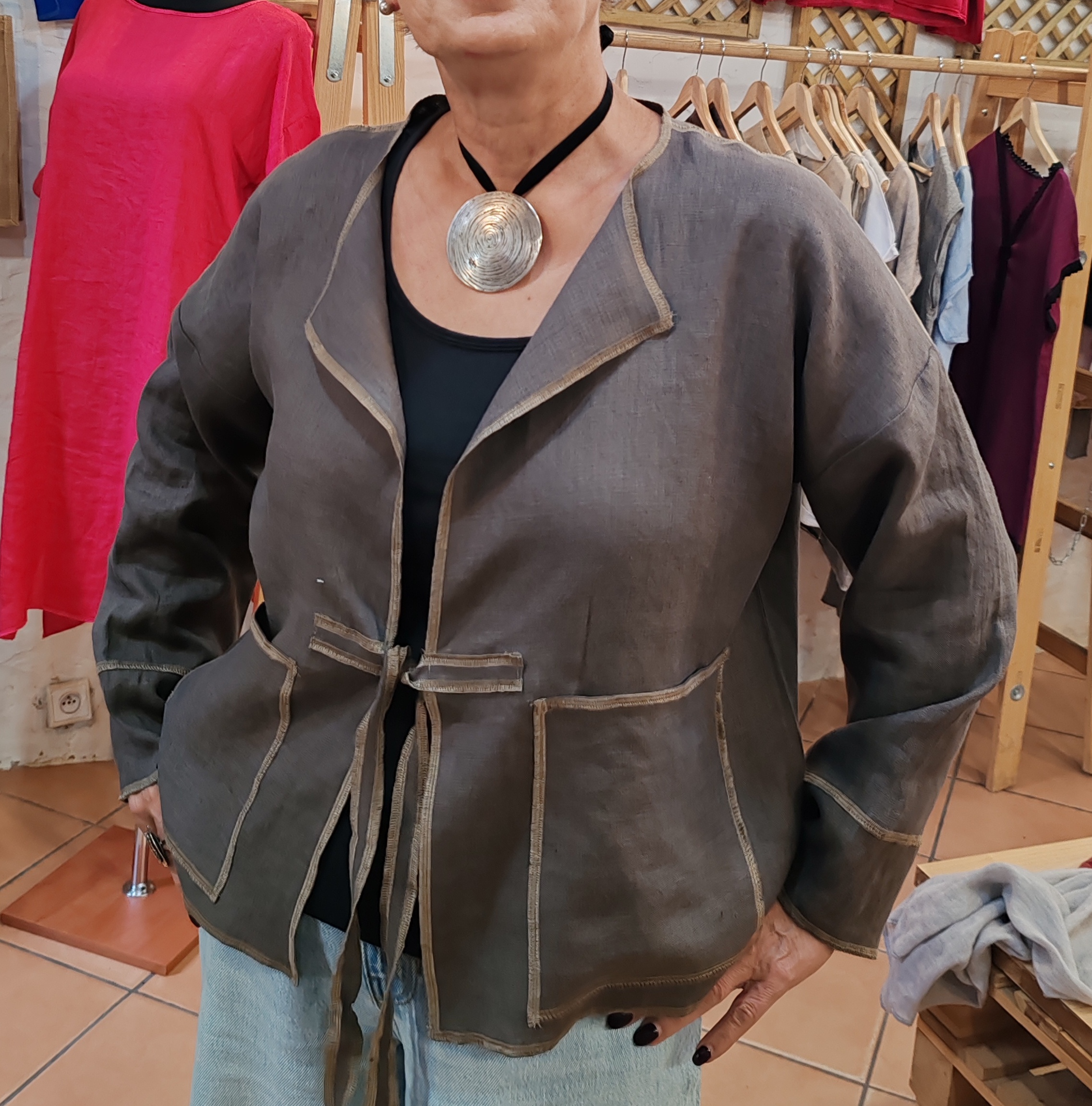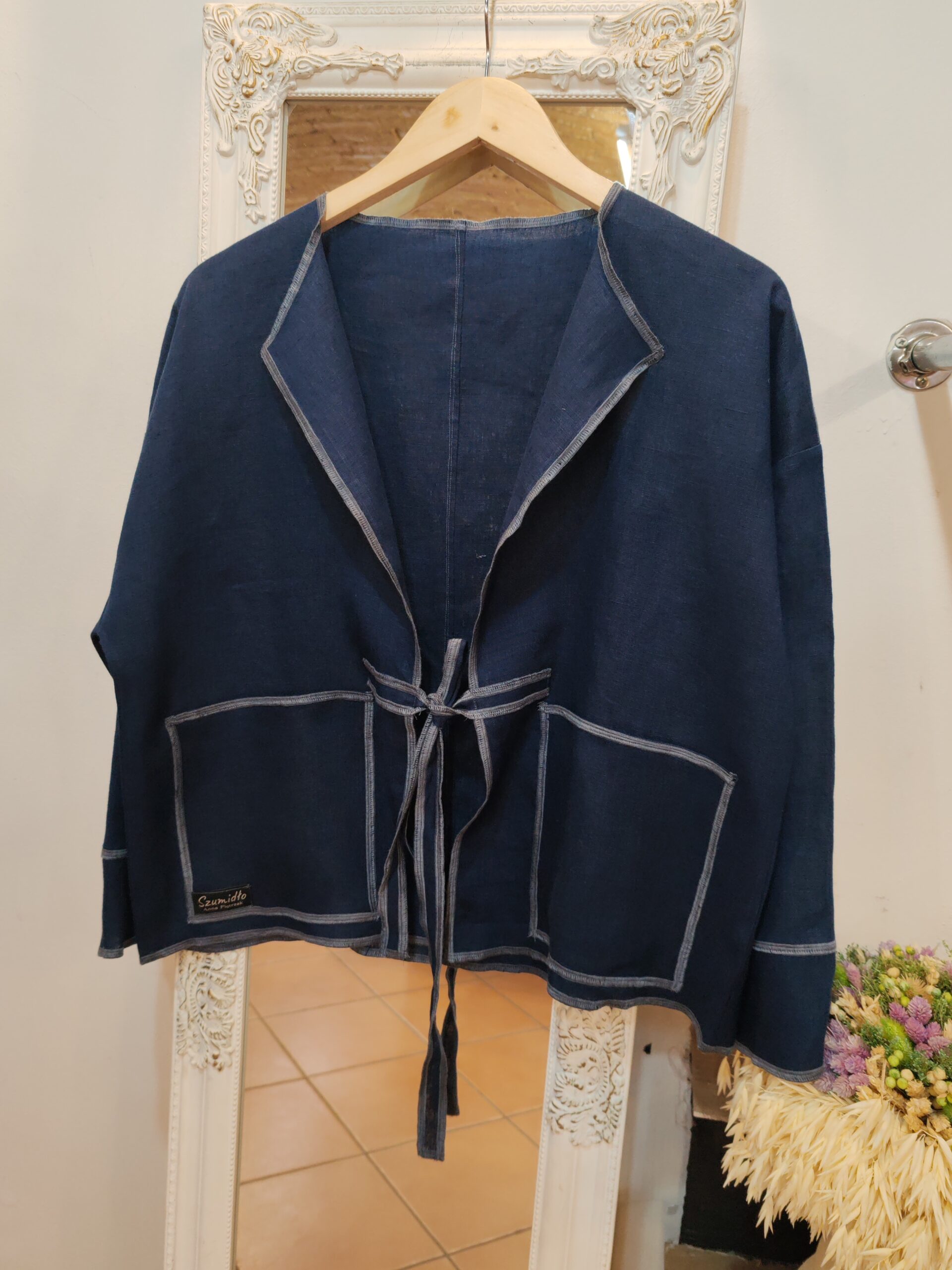 Zewnętrzne kieszenie oraz kontrastujące obszycia krawędzi subtelnie podkreślają linię żakietu i jego rękodzielniczy, autorski charakter. Oddychająca lniana tkanina sprawia, że model doskonale sprawdza się w codziennym rytmie, blisko ciała i natury.